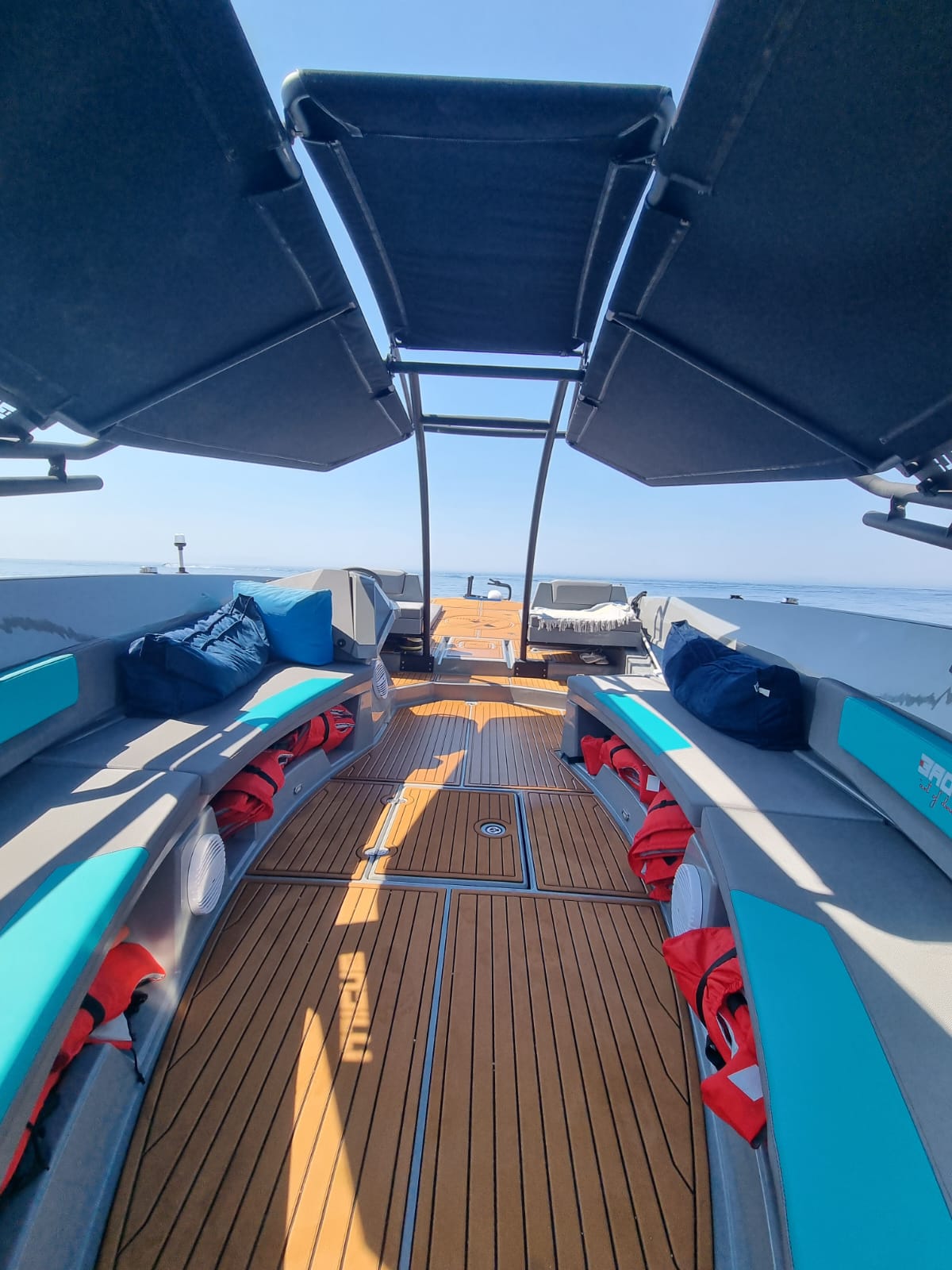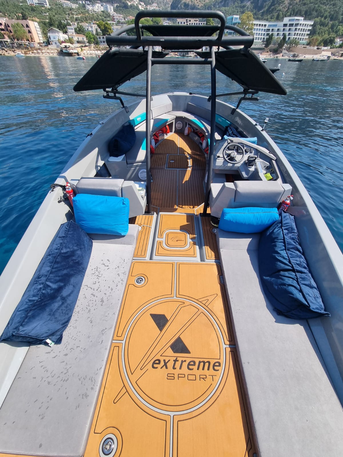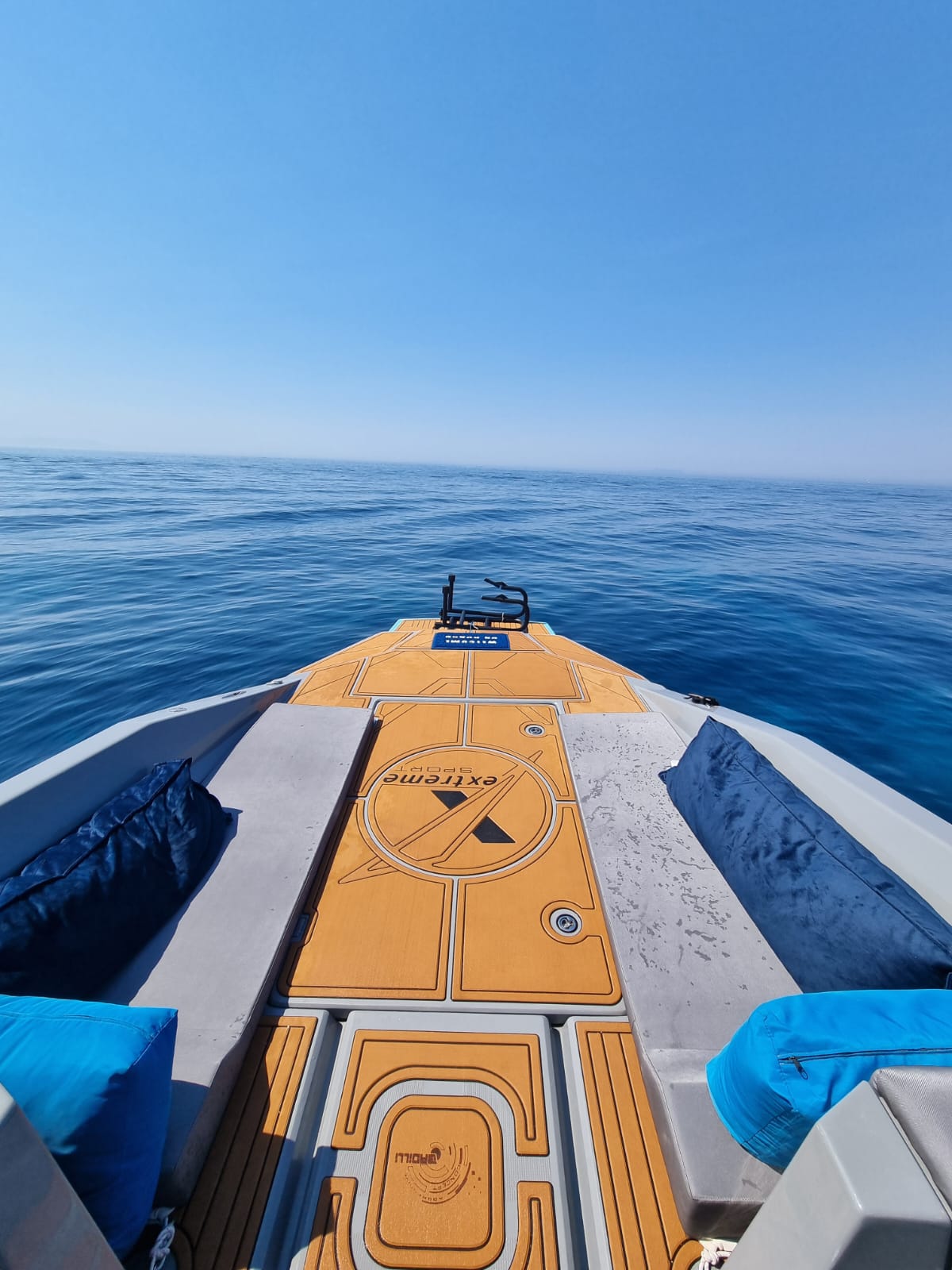 This is a new powerful speedboat, built to accommodate ap to ten people in comfort through deep blue water seas.
