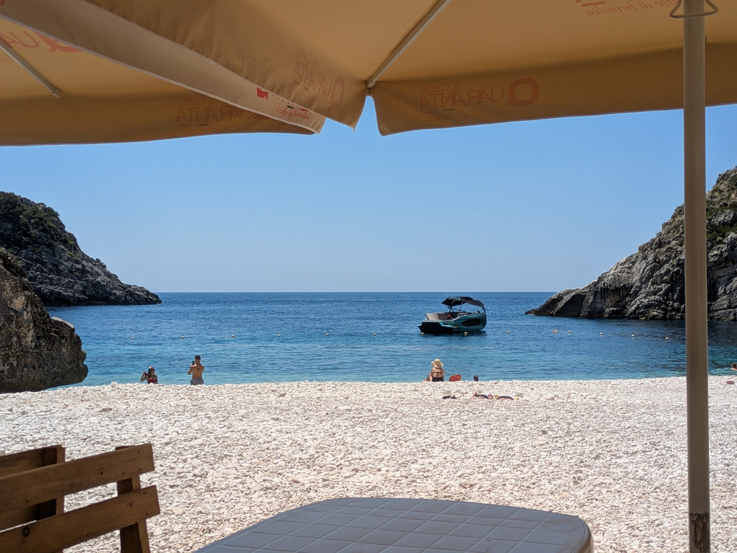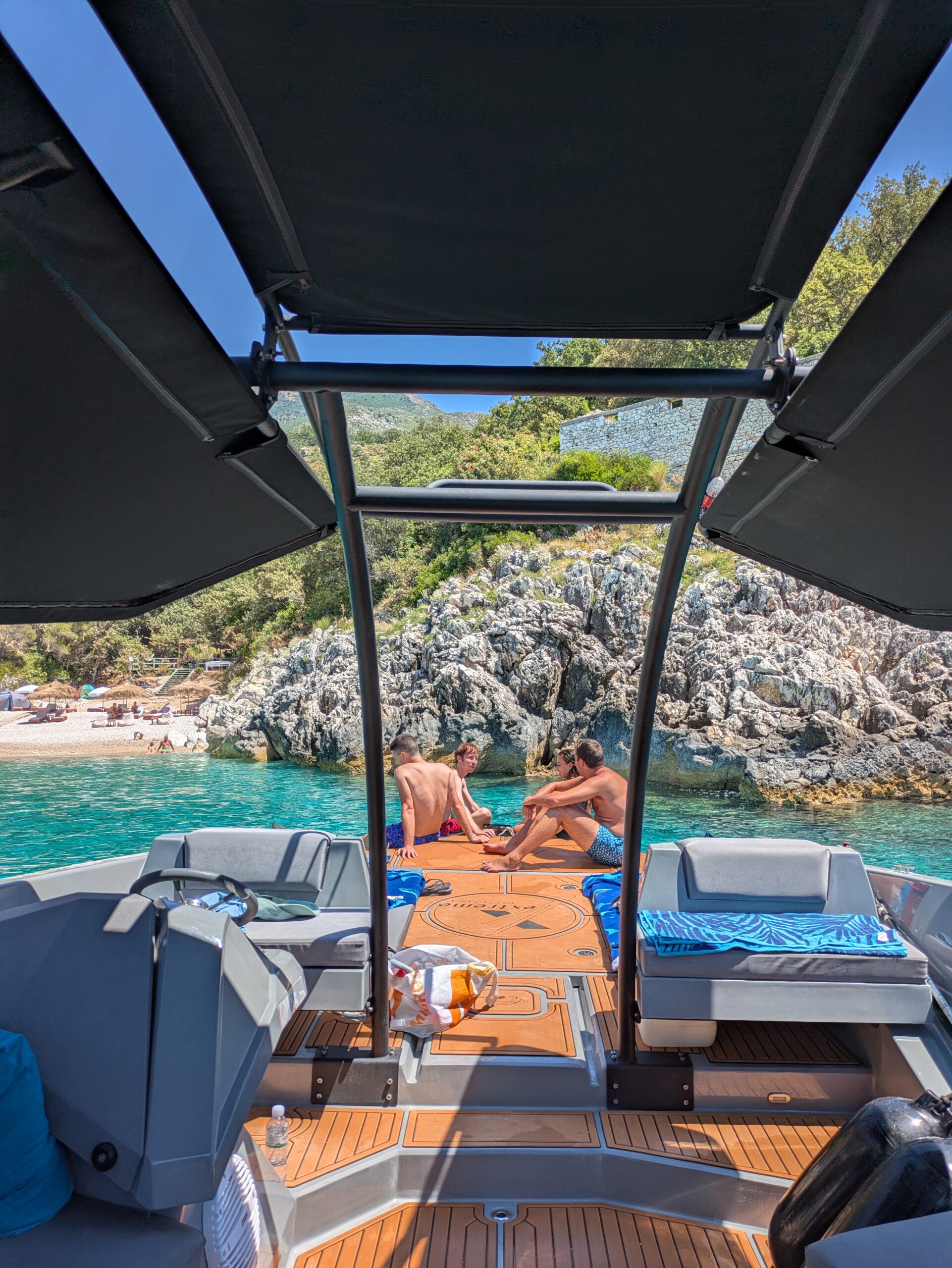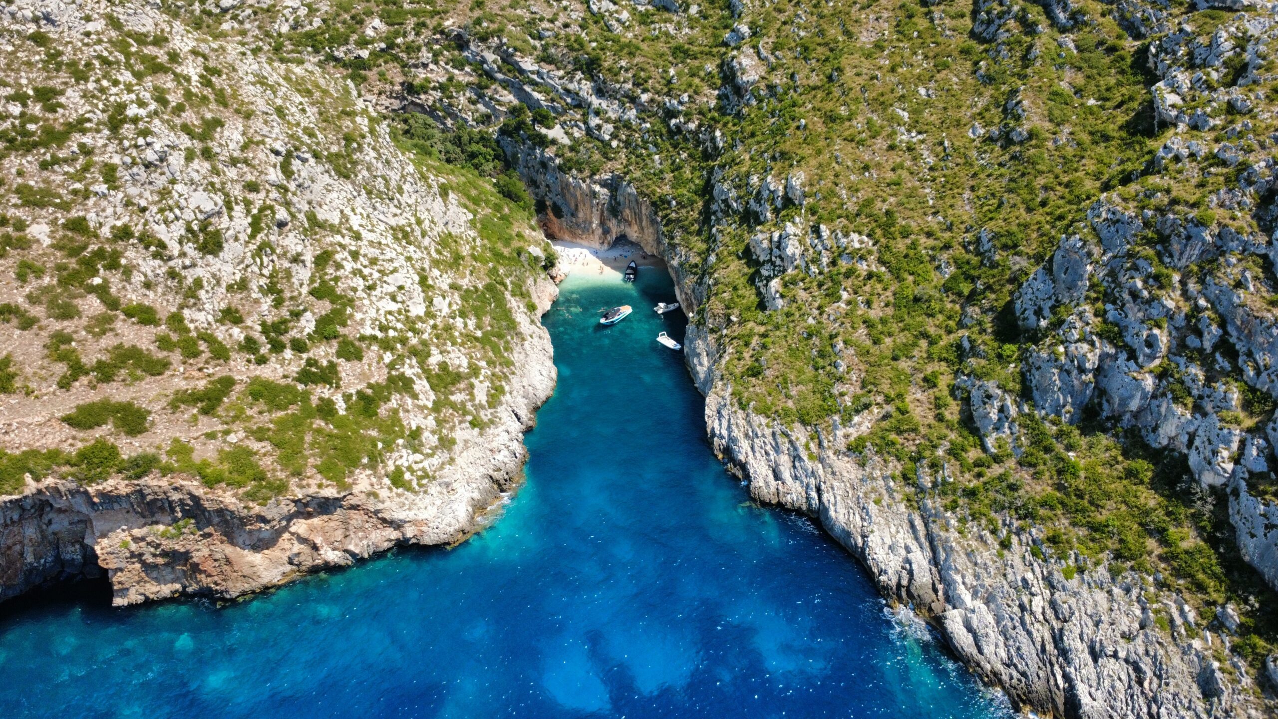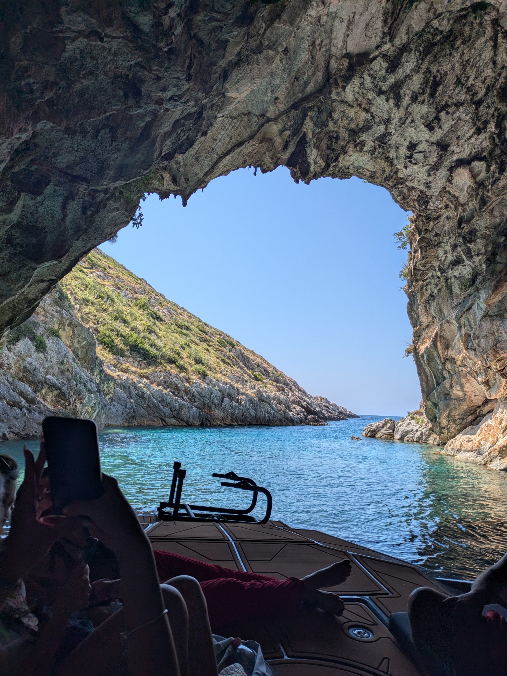 Tour of the coastline of Karaburun from Dhermi beach to Grama bay, Secret Blue cave, including Saint Andreas bay, Thunder cave, Blue Gem cave, with swimming stops.